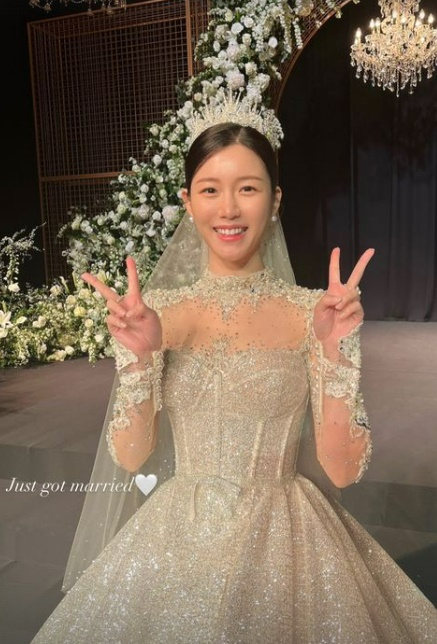 이와 함께 그는 웨딩드레스를 입고 결혼식장에 서있는 자신의 사진을 공개했다. 이다인은 디즈니 공주를 연상시키는 화려한 코르셋 디자인의 드레스와 티아라를 착용한 채 브이 자 포즈와 행복한 미소를 선보였다. 이다인은 여기에 'Just got married♥"라고 덧붙이며 기쁜 마음을 전했다.