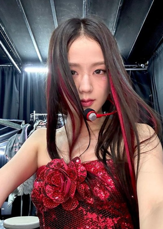 공개된 사진에는 꽃이 달린 빨간색 드레스를 입은 지수가 이어 마이크를 착용한 채 카메라를 응시하는 모습이 담겼다. 지수는 붉은색 의상과 헤어스타일을 완벽하게 소화하며 치명적인 매력을 자랑했다.