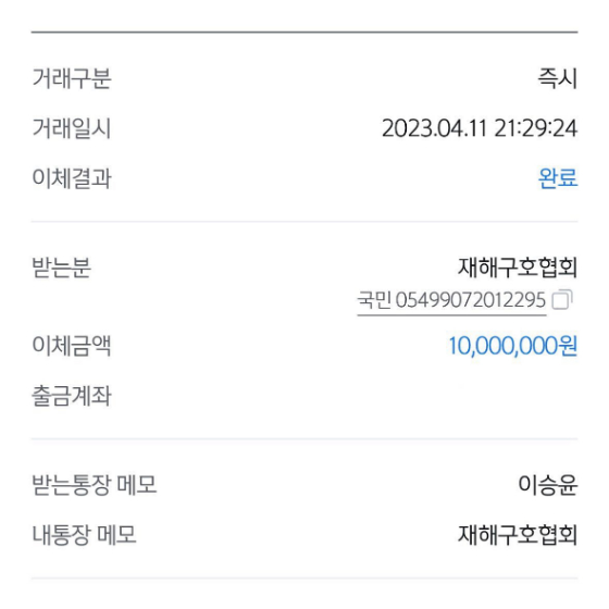 이승윤은 이와 함께 희망브리지전국재해구호협회에 1000만원을 기부한 인증 사진도 게재했다. 이날 오전 강원 강릉에서 산불이 발생해 많은 이들이 피해를 입었다.