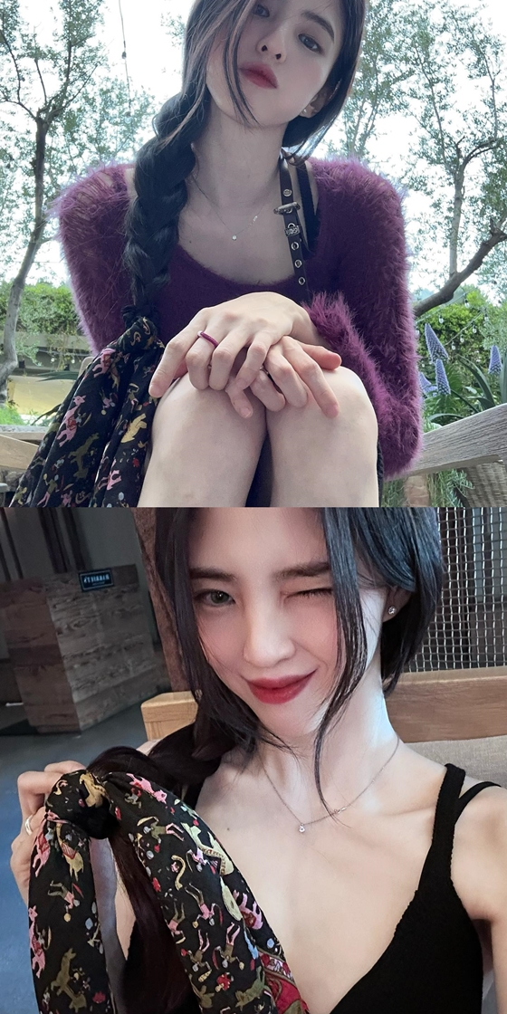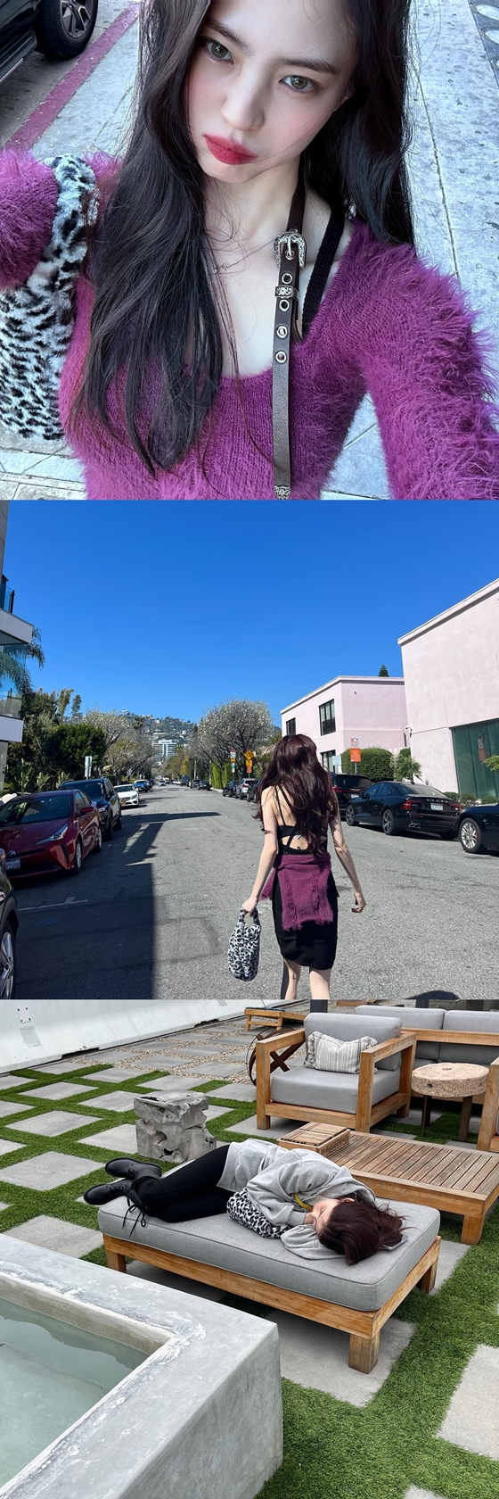 또 다른 사진에는 윙크를 하는 표정, 야외에 있는 소파에 누운 모습은 한소희만의 발랄하고 귀여운 매력이 가득하다.