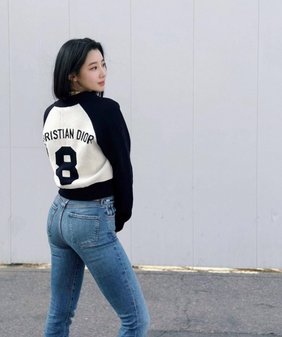 사진에서 조현은 명품 브랜드가 새겨진 긴팔 상의를 입고 스키니한 청바지를 입고 뒤태를 과시하고 있다.