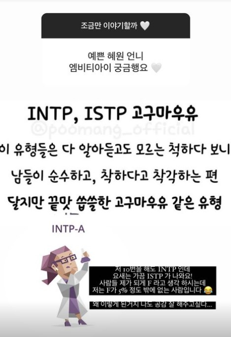 유혜원은 자신의 MBTI에 대해서는 "10번을 해도 INTP인데 요새는 가끔 ISTP가 나온다. 사람들이 내가 되게 F라고 생각하시는데 저는 F가 5% 정도밖에 없는 사람입니다. 왜 이렇게 된거지 나도 공감 잘해주고 싶다"라고 답했다.