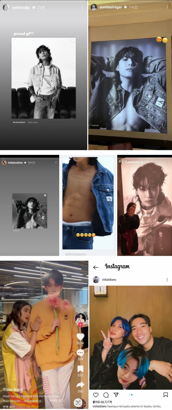 인도네시아 여배우 유니타 시레가르(Yunita Siregar)와 베비 차 비나(Beby Tsabina), 가수 Tika Ramlan 또한 SNS를 통해 정국의 캘빈클라인 화보 사진과 영상을 올리며 뜨거운 애정을 과시했다. 인도네시아 모델이자 배우 Dini Hanipah는 정국의 캘빈클라인 대형 화보 사진 앞에서 행복한 표정을 지으며 인증 사진을 찍어 SNS에 업로드하며 팬심을 드러냈다.