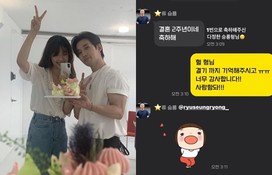 이에 류뎍환은 '헐. 형님. 결기(결혼기념일)까지 기억해 주시고 너무 감사합니다. 사랑합니다'라고 답장해 훈훈함을 자아냈다.