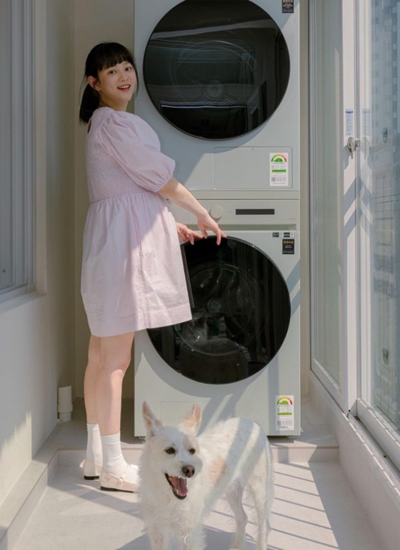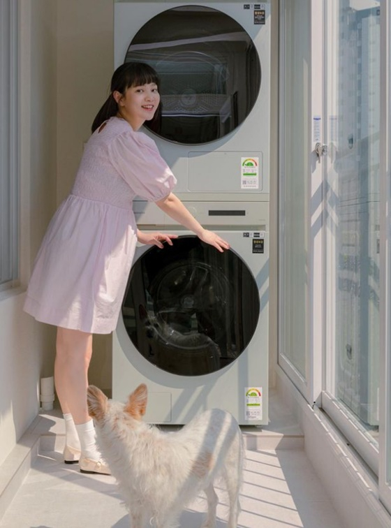 공개된 사진에는 세탁기 앞에서 포즈를 취한 윤승아의 모습이 담겼다. 네 마리의 반려견 중 한 마리의 모습도 포착됐다.