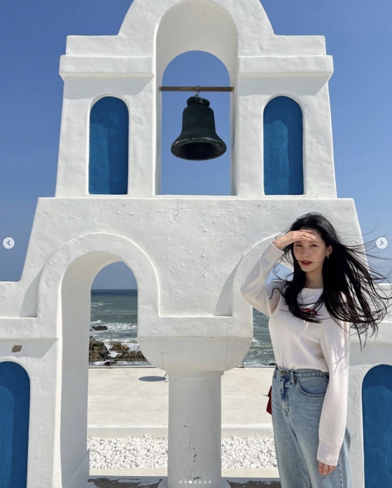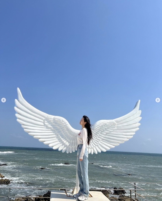 공개된 사진 속 서현은 흰색 셔츠에 청바지를 입고 날개 조형물 앞에서 청순한 미모를 뽐냈다.