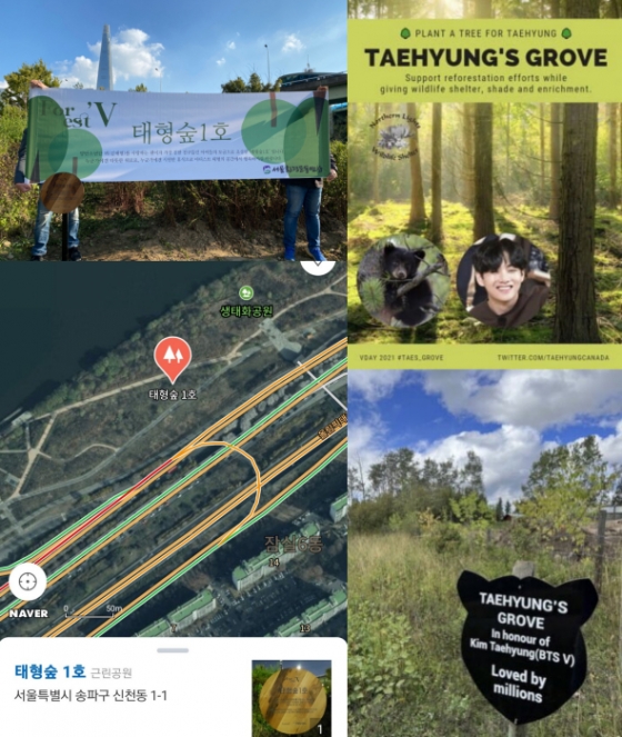또, 뷔의 캐나다 팬들도 '노던라이트 야생동물 보호소(Northern Lights Wildlife Shelter)'에 기금을 기탁해 태형숲을 조성했다.