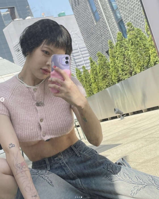 공개된 사진 속 현아는 핑크색 언더붑 니트에 옆면이 트인 청바지를 입어 섹시미를 발산했다.