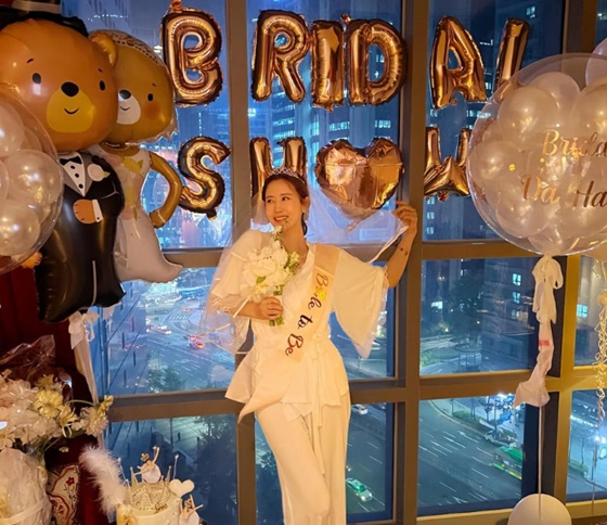 또 다른 사진에서는 파티 풍선 앞에서 인증샷을 남기는 이다해의 모습이 포착됐다. 그는 면사포를 길게 늘어트리며 행복을 만끽했다.