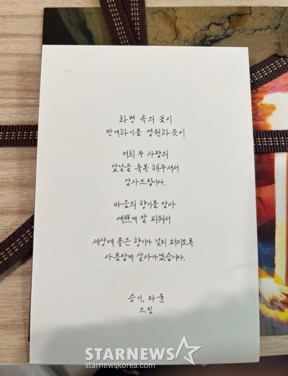 답례품 안에는 이승기와 이다인이 전한 편지도 있었다. 편지 내용으론 "화병 속의 꽃이 만개하기를 염원하듯이 저희 두 사람의 앞날을 축복해 주셔서 감사드립니다. 마음의 향기를 담아 예쁘게 잘 피워서 세상에 좋은 향기가 널리 퍼지도록 아름답게 살아가겠습니다. 승기, 라윤 드림"이라고 적혀 있었다.