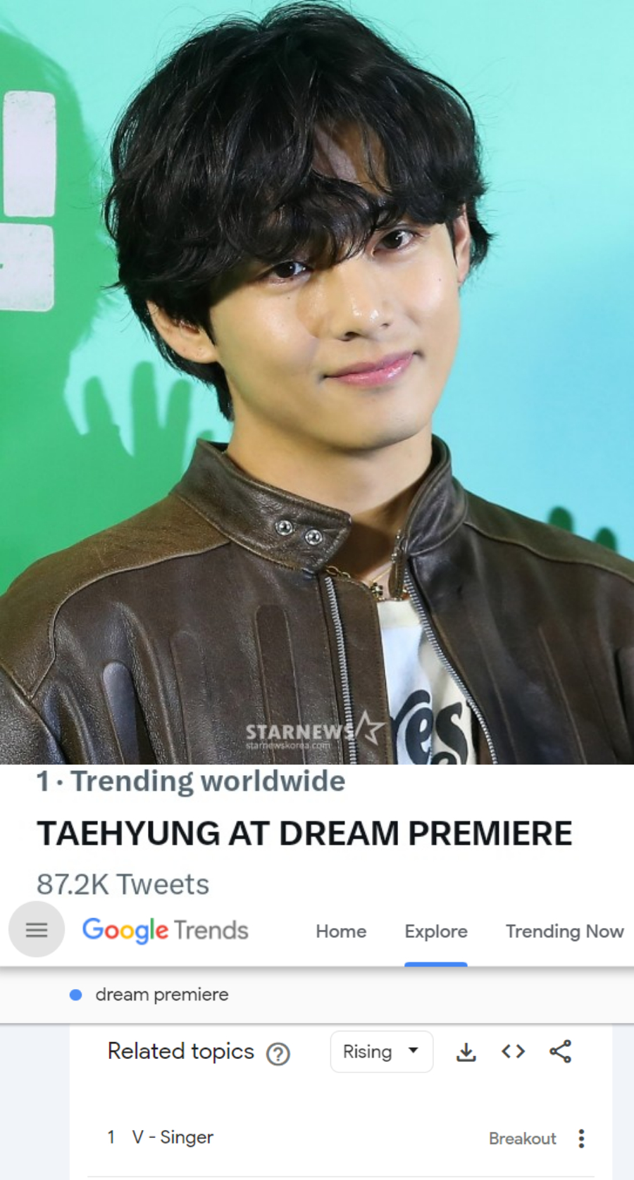 SNS에는 'TAEHYUNG AT DREAM PREMIERE'가 월드와이드 실시간 트렌드 1위를 장식하며 독보적인 화제성을 자랑했다. 구글 트렌드 'Dream Premiere'에서는 '뷔(V-Singer)'가 증가율급증(Break Out)을 기록하며 관련 토픽 Rising 1위에 올랐다.