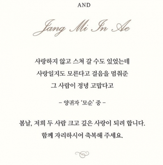 공개된 청첩장 속엔 "사랑하지 않고 스쳐 갈 수도 있었는데 사랑일지도 모른다고 걸음을 멈춰준 그 사람이 정녕 고맙다고"란 양귀자의 '모순' 한 구절이 담겨있다. 또한 "봄날, 저희 두 사람 크고 깊은 사랑이 되려 합니다. 함께 자리하시어 축복해주세요"란 말을 덧붙였다.