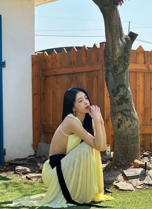 공개된 사진 속 미주는 등 파인 연두색 드레스를 입고 여러 포즈를 취하고 있다. 특히 그가 입은 드레스는 아래로 갈수록 비치는 형태로, 남다른 분위기를 풍긴다.