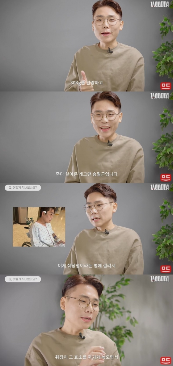 송필근은 지난 25일 공개된 유튜브 채널 '웃다미디어'에 출연했다. '필근아? 이게 말이 되니?'라는 제목의 영상에 등장한 송필근은 "30kg 감량하고 죽다 살아온 개그맨 송필근이다"라며 괴사성 급성 췌장염 투병 이후 급격하게 핼쑥해진 외모를 공개했다.