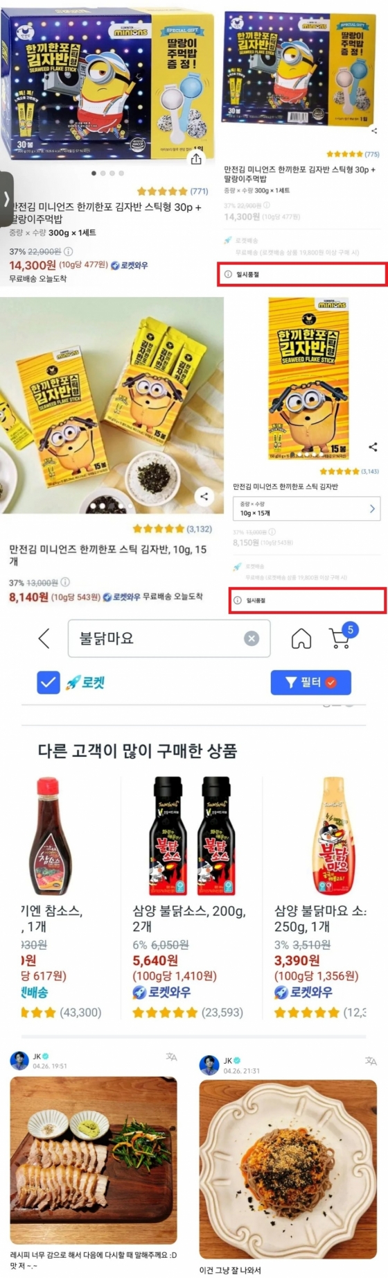 이에 '쿠팡' 홈페이지에서는 정국이 사용한 김자반 제품이 품절, 요리템마저 불티나게 팔리게 만드는 '정국 효과'의 막강한 파급력을 또 한번 실감케 했다.