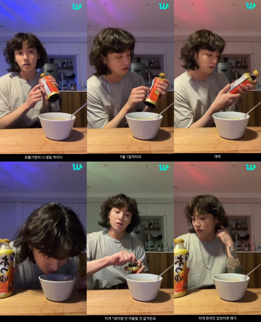 정국은 "(혼쯔유)유통기한이 내 생일까지다! 9월1일까지야 대박!"이라고 신기하다는 듯 놀라며 냄새를 맡은 뒤 "이게 불닭이랑 안 어울릴거 같거든?"이라고 특제 소스에 추가하지 않았다.