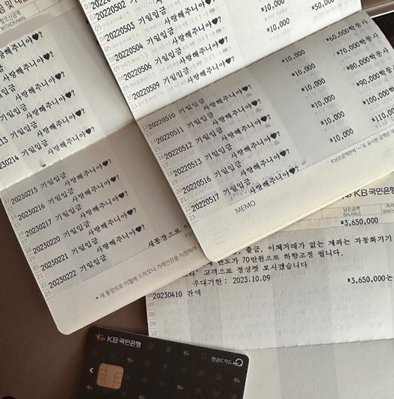 이와 함께 남편에게 받은 통장 사진을 공개했다. 사진 속 통장에는 '사라해 주니야♥'라는 문구와 함께 매일 1만원이 입금된 내역이 적혀 있다.