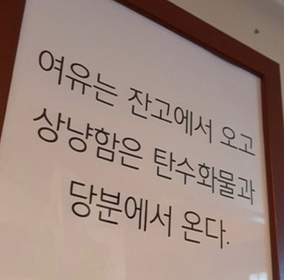 전다빈은 2일 재치 있는 액자 속 문구를 공개했다. 글귀에는 "여유는 잔고에서 오고 상냥함은 탄수화물과 당분에서 온다"라고 적혀 있다.