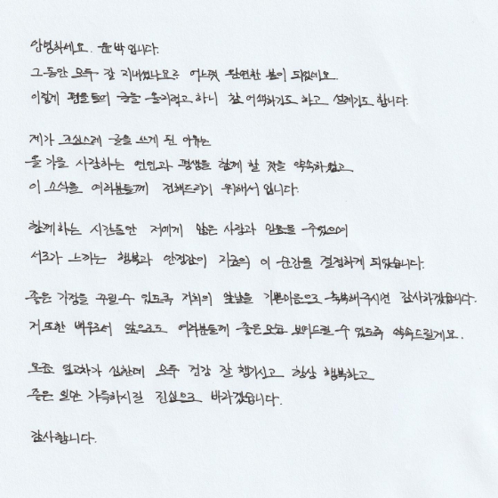 배우 윤박이 손 편지로 결혼을 발표했다.