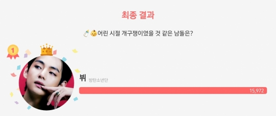 방탄소년단(BTS) 뷔가 '어린 시절 개구쟁이였을 것 같은 남자 아이돌' 1위에 오르며 인기를 빛냈다.