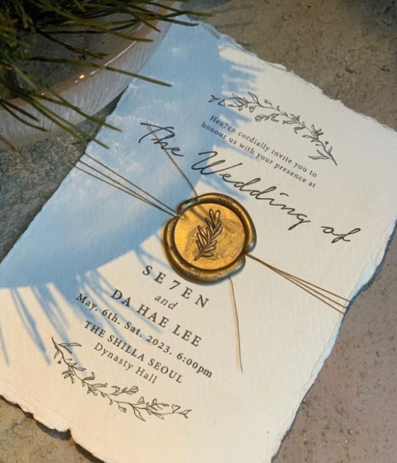한 디자인 업체는 6일 공식 SNS 채널을 통해 "곧 세븐&이다해 님의 결혼식 두근두근. 두 분의 결혼을 진심으로 축하드리고 항상 행복한 일만 가득하시길 진심으로 응원합니다"라며 "가수 세븐 & 배우 이다해님께서 선택하신 클래식 청첩장. 매력적인 수제종이에 하나하나 수작업으로 완성되는 왁스씰링을 더해 청첩장의 기품을 한층 높였습니다"라고 밝혔다.