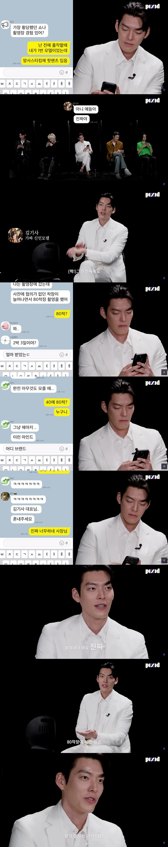 이날 공개된 영상에서 김우빈은 익명으로 진행되는 메신저 대화에 참여해 신인 모델인 척 연기해야 했다.