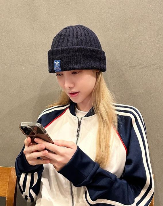 공개된 사진에는 비니를 쓰고 휴대전화를 응시하는 유깻잎의 모습이 담겨 있다.
