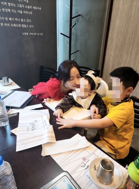 사진에서 황정음은 두 아들과 식당에 나란히 앉아 포즈를 취했다. 황정음은 둘째 아들의 볼에 자신의 얼굴을 갖다대며 미소를 지었다.