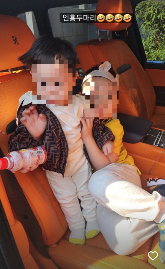 다른 사진에는 차 안에서의 두 아들이 카메라를 바라보고 있다. 특히 이들이 탄 롤스로이스 로고가 함께 눈길을 끌고 있다.