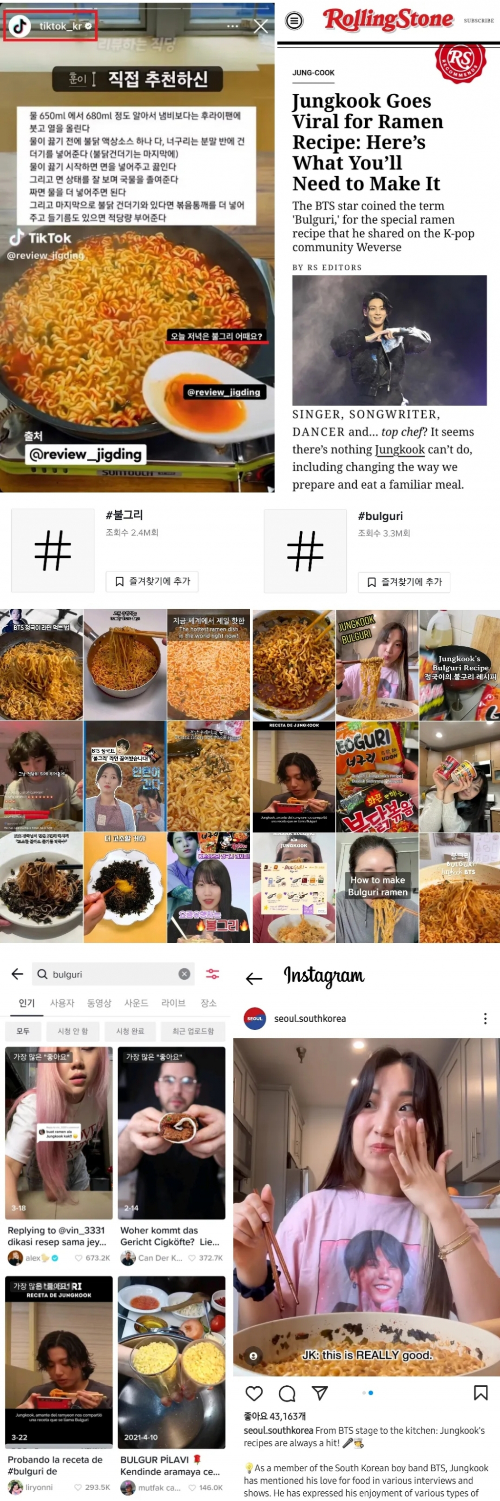 'Seoul. South Korea' 공식 인스타그램에서도 정국의 '불그리 레시피'를 직접 요리해 먹는 영상을 게재하며 "이거 정말 맛있다" 라고 맛을 평가한 후 최고라는 듯 엄지척을 내세웠다.