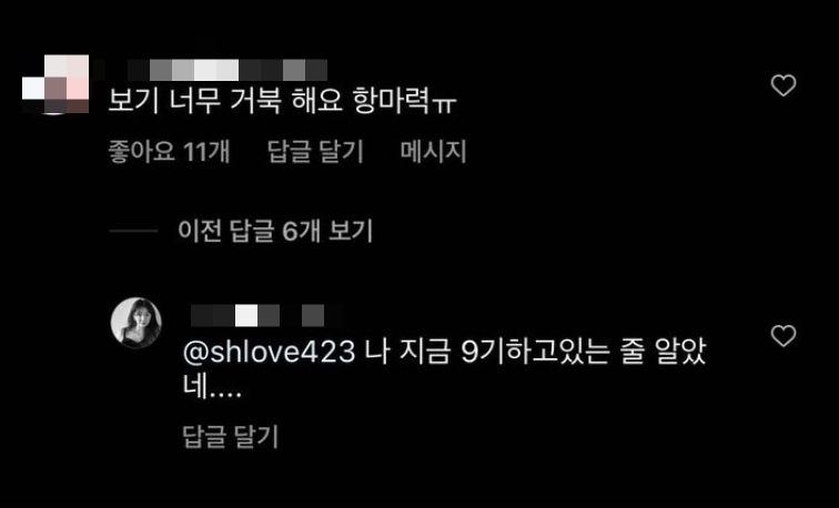 다른 댓글에서는 "보기 너무 거북해요 항마력 ㅠ"이 적혔고 이에 고초희는 "나 지금 9기 하고 있는 줄 알았네"라고 답했다.