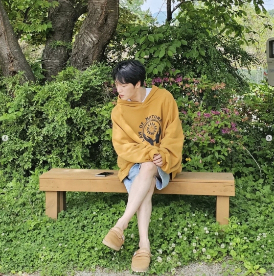 공개된 사진 속 김재중은 야외에 놓여있는 벤치 아래에서 네잎클로버를 찾았다. 김재중은 후드티에 청 반바지를 입고 웅크리고 앉아 귀여운 매력을 자아냈다.