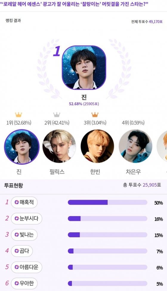 진은 4월 2주 '향기로 기억되는 추억 '르 라보 향수'가 잘 어울리는 '분위기 있는' 스타'', 4월 3주 '전역 후 활동이 기다려지는 '기대감 넘치는' 스타', 4월 4주 '사랑하면 닮는다더니, 자신의 반려동물과 '똑 닮은' 스타', 4월 5주 '요리 예능에 출연하면 '시청자들의 마음을 사로잡을' 스타', 5월 1주 '뉴발란스 운동화가 잘 어울리는 '스포티한' 매력의 스타'에 이어 5월 2주 ''로레알 헤어 에센스' 광고가 잘 어울리는 '찰랑이는' 머릿결을 가진 스타'에서도 1위에 오르며 6주 연속 우승으로 막강 팬덤 파워를 과시했다. 진은 군백기에도 변함없는 팬들의 사랑을 확인하고 있다.