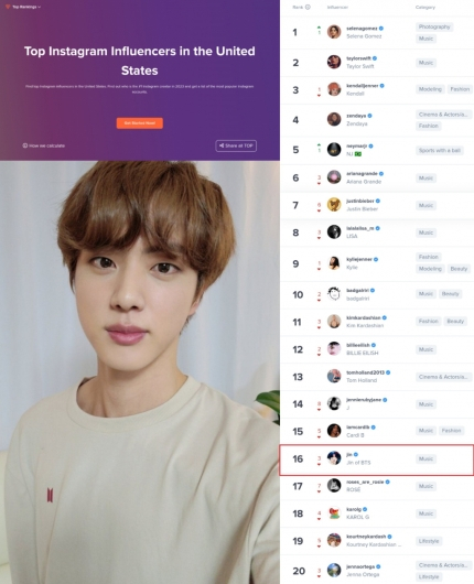 전 세계 남성 중에서는 축구 선수 네이마르, 가수 저스틴 비버, 배우 톰 홀랜드에 이어 4위의 기록이다. 전 세계 최유명 여성 셀럽들이 상위권의 대다수를 차지한 가운데 오랫동안 높은 순위를 유지하고 있는 진의 막강한 영향력이 더욱 이목을 끌고 있다.