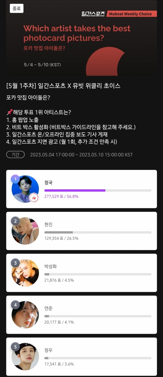 앞서 정국은 뮤빗에서 진행한 '포카 장인 남자 아이돌은?' 설문에서도 1위에 오른 바 있다.
