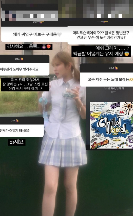 최준희는 자신의 머리 색깔에 대해서는 "애쉬 그레이"라며 "백금발 어떻게든 유지 예정"이라고 답했고 "피부 관리는 귀찮아서 잘 안해요. 그냥 스킨 로션 신경써서 구매한다"라고 답했다.
