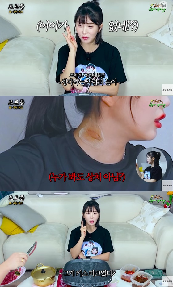 조현영은 "무슨 키스 마크 논란이야. 무슨 키스 마크래. 그걸 보고 키스 마크라고 생각하는 사람이 잘못"이라며 억울함을 호소했다.