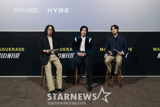 정우용 하이브IM 대표, 미드낫(이현), 신영재 빅히트뮤직 대표가 15일 오후 서울 용산구 CGV 용산아이파크몰에서 진행된 빅히트 뮤직-하이브IM 미드낫(MIDNATT)의 디지털 싱글 '마스커레이드'(Masquerade) 발매 기념 기자 간담회에 참석해 취재진과 만나고 있다.