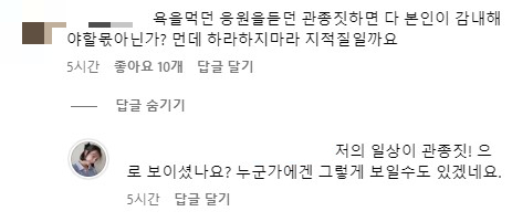 하지만 이 게시글에 대해 일부 네티즌들이 곱지 않은 시선을 보냈고 이에 조예영이 직접 댓글을 달며 시선을 모았다. 조예영은 한 네티즌이 "욕을 먹든 응원을 듣든 관종짓 하면 다 본인이 감내해야 할 몫 아닌가? 뭔데 하라 하지마라 지적질일까요?"라고 댓글을 달자 "저의 일상이 관종짓!으로 보이셨나요? 누군가에겐 그렇게 보일수도 있겠네요"라고 답했다.