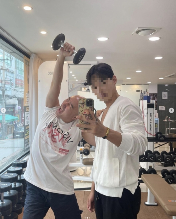 공개된 사진 속 홍석천은 한 손으로 아령을 번쩍 들고 훈남 트레이너와 함께 사진을 찍었다. 홍석천은 장난스러운 표정을 지으며 운동을 즐겼다.