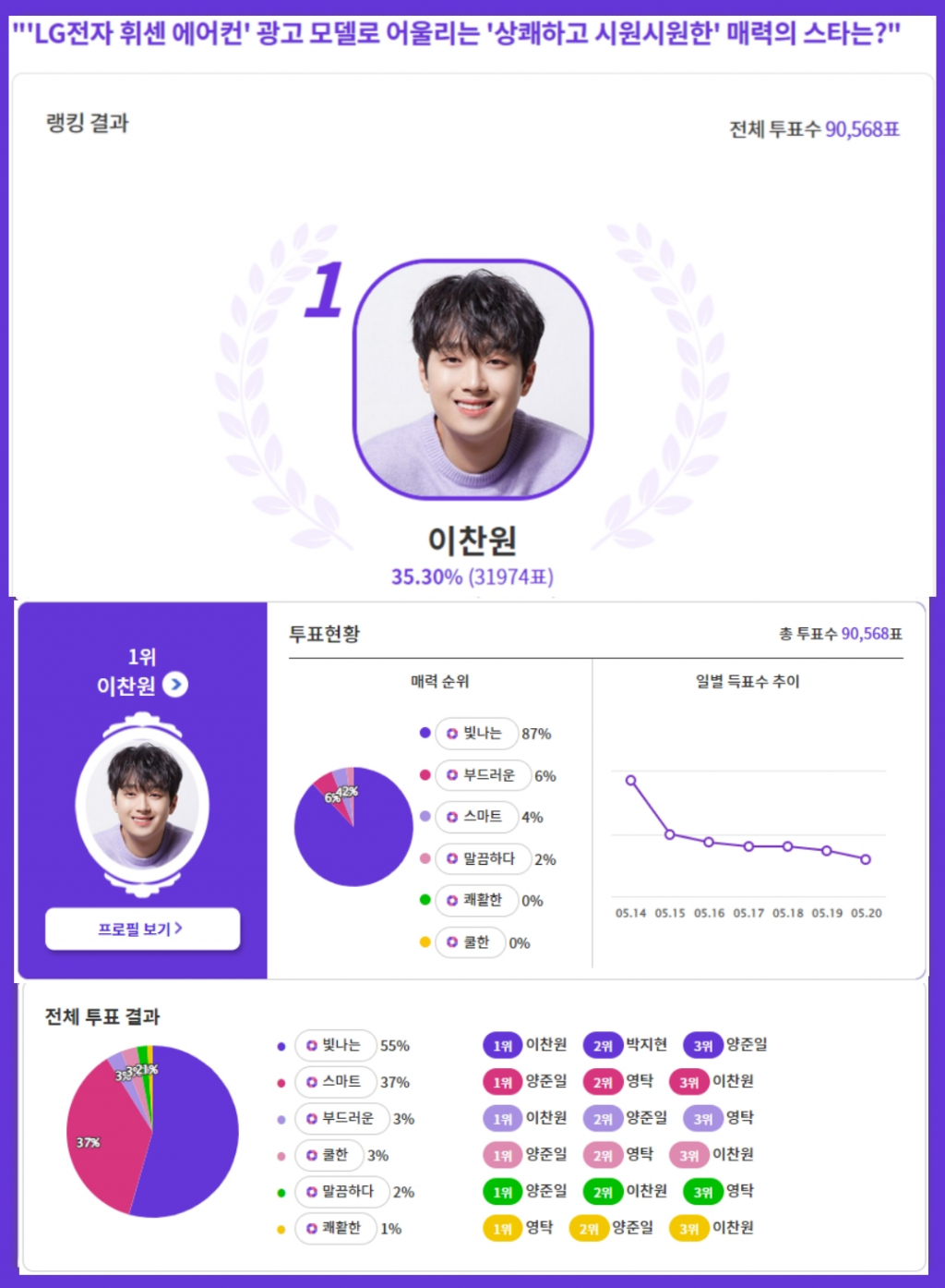 가수 이찬원이 에어컨 광고 모델로 어울리는 상쾌하고 시원시원한 매력의 스타 1위를 차지했다.