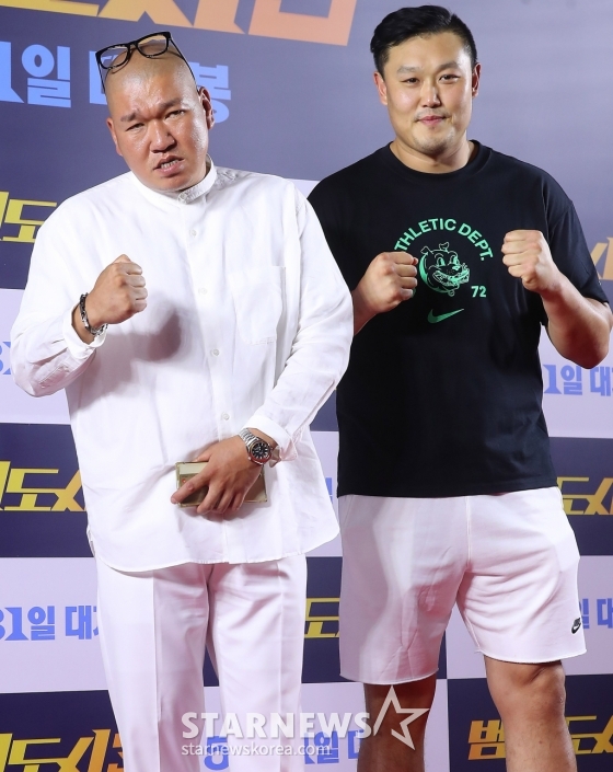 유튜버 버거형, 명현만이 22일 오후 서울 강남구 메가박스 코엑스에서 진행된 영화 '범죄도시3' VIP시사회에 참석해 포즈를 취하고 있다.