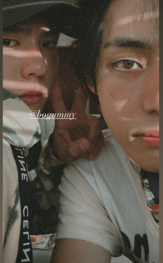 공개된 사진에는 뷔와 박보검이 함께 한 모습이 담겼다. 박보검은 손가락으로 'V'(브이) 포즈를 취했고, 뷔는 카리스마 눈빛으로 팬들의 시선을 사로잡았다.