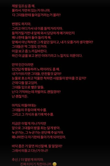 이어 그는 "변명도 하지마. 어디가서 내 이름 들먹거리지 마. 앞에서 아닌 척하면 그게 없던 일이고, 내가 모를거라 생각했어?"라며 "내가 터뜨리면 그대들 안전할 것 같아?"라고 분노를 드러냈다.