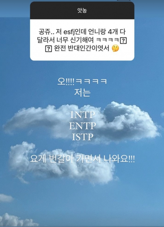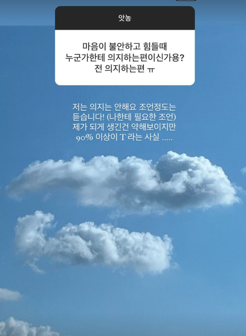 또한 "마음이 불안하고 힘들 때 의지는 안해요. 조언 정도는 듣습니다.(나한테 필요한 조언) 제가 생긴 건 약해 보이지만 90% 이상이 T라는 사실"이라고 밝히고 자신의 MBTI에 대해 "INTP ENTP ISTP가 번갈아 나온다"라고 답했다.