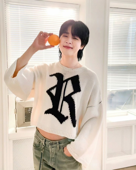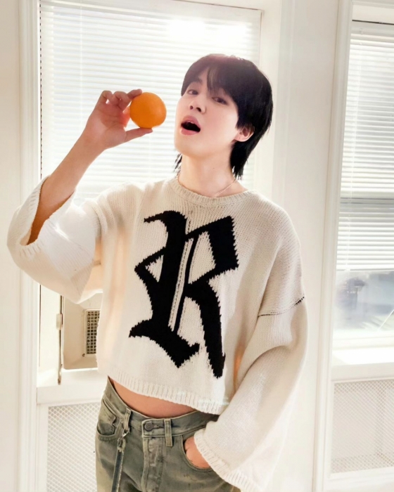사진 속에서 눈부신 햇살이 드리우는 창가를 배경으로 선 지민은 블루진에 화이트 크롭 니트를 착용해 날씬한 허리 라인의 슬림하고 탄탄한 몸매가 절로 시선을 사로잡는다.