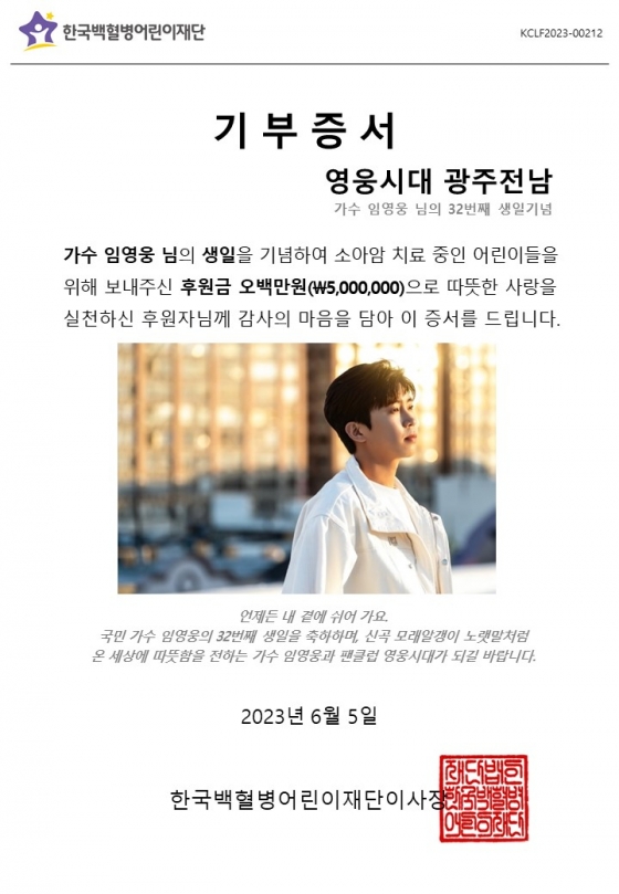 임영웅 팬클럽 영웅시대 광주전남은 6월 8일 소아암 전문 비영리단체 한국백혈병어린이재단에 500만 원을 기부했다.