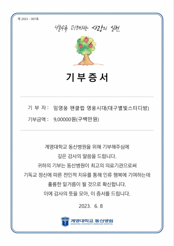 동산병원 김준형 행정부원장은 "누군가를 열정적으로 좋아하고 응원하는 모습이 행복해 보인다"며 "기부금은 치료를 기다리는 환자들을 위해 소중하게 사용하겠다"고 전했다.
