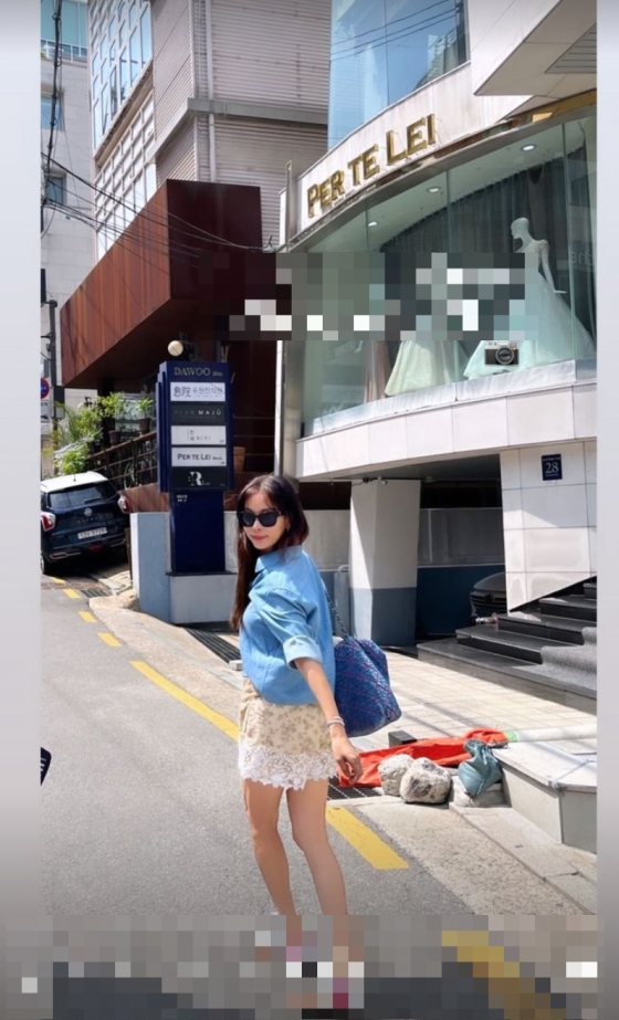 사진에서 고소영은 선글라스를 착용하고 시원한 느낌의 셔츠와 반바지를 입고 거리를 걷고 있다.