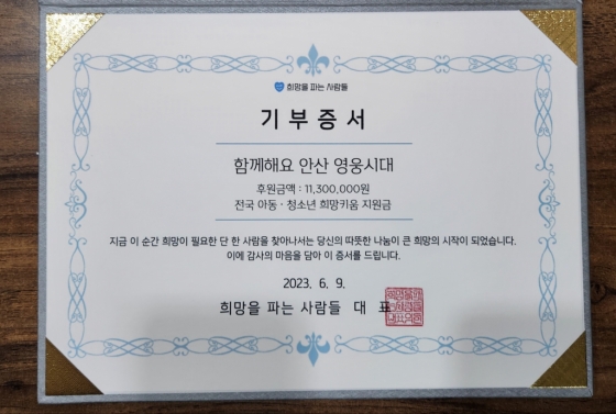 임영웅 팬클럽 '함께해요 안산 영웅시대'는 6월 9일 희망을 파는 사람들에 전국 아동 청소년 희망 키움 지원금 1130만 원을 기부했다.